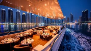 Sail the Arabian Gulf on a Dubai marina dinner cruise. Indulge in gourmet cuisine and enjoy breathtaking views for a magical evening.