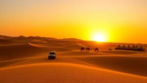 Imagine being on the edge of endless golden dunes. The sun warms the vast landscape, creating a perfect scene. This moment goes beyond just a