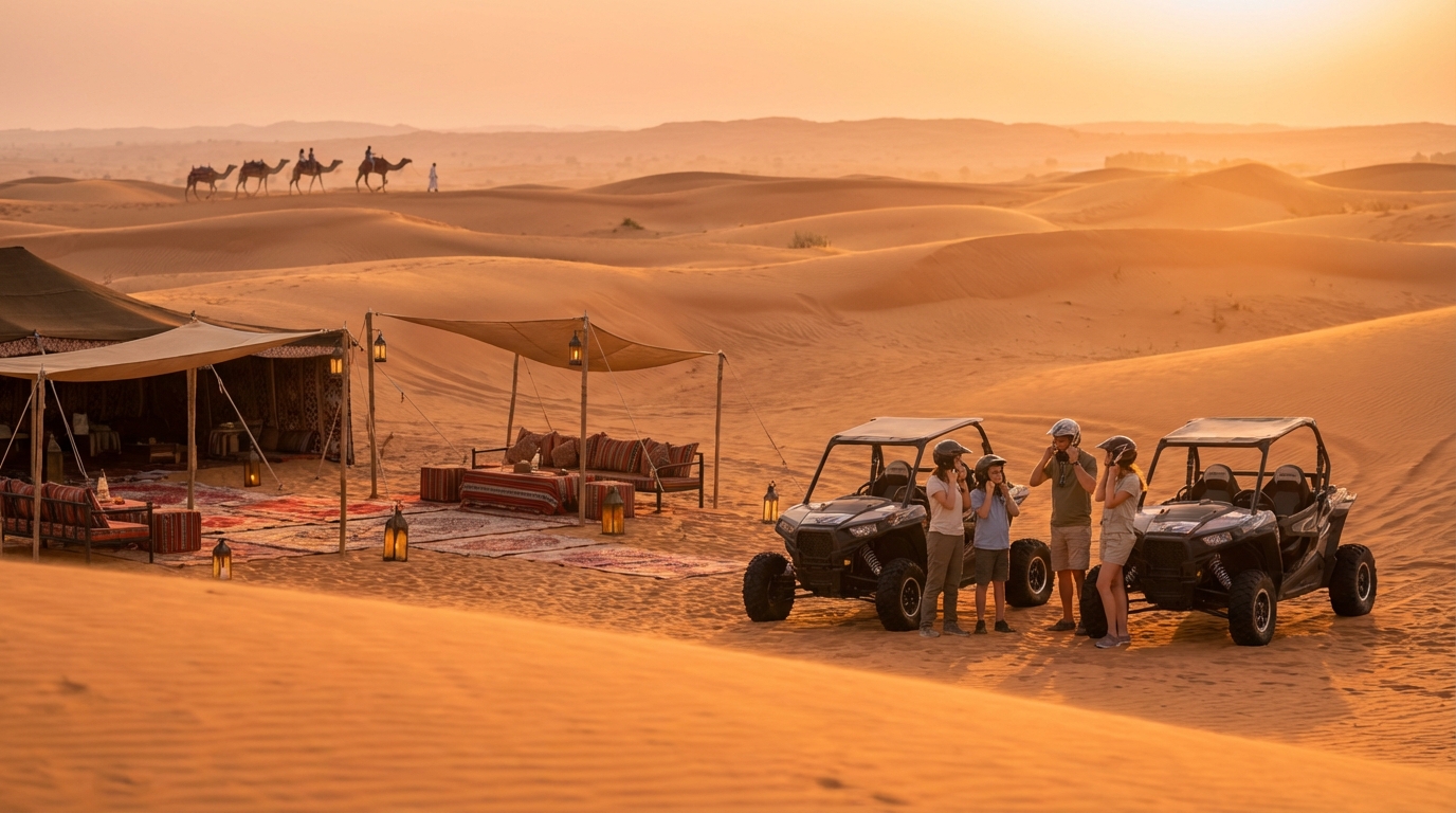 Camel rides, sandboarding and kids’ zones keep non-drivers engaged while others take motorised runs. Private camps make these options less crowded and more comfortable.