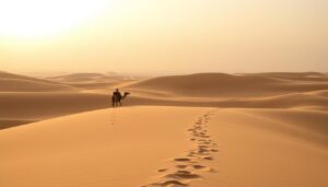 Imagine standing at the edge of vast golden sands. They stretch towards the horizon, glowing under the dawn’s first light. As the sun rises, it