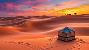 Imagine standing amidst endless sun-kissed dunes. The golden sands shift gently beneath your feet as the sun sets. The sky turns orange and pink. This