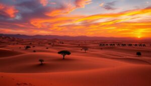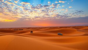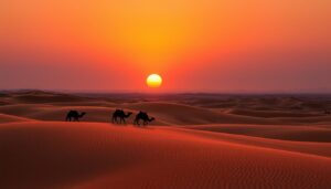 Picture yourself on the brink of a vast ocean of golden sand. The sun sets, coloring the sky orange and pink. This isn’t just a
