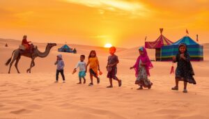 Imagine yourself in the vast Arabian desert, where golden sands glow under the sunset. The sounds of laughter and traditional music fill the air. They