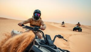 Imagine yourself in Dubai’s vast desert, surrounded by endless golden sand dunes. The thrill of desert quad biking awaits you. As you start this adventure,