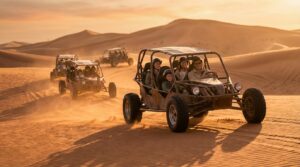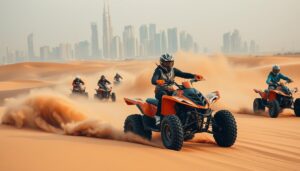 Imagine the sun setting over the vast Dubai desert. It casts a golden glow over the sand dunes. You grip a powerful quad bike’s handlebars,